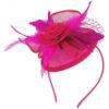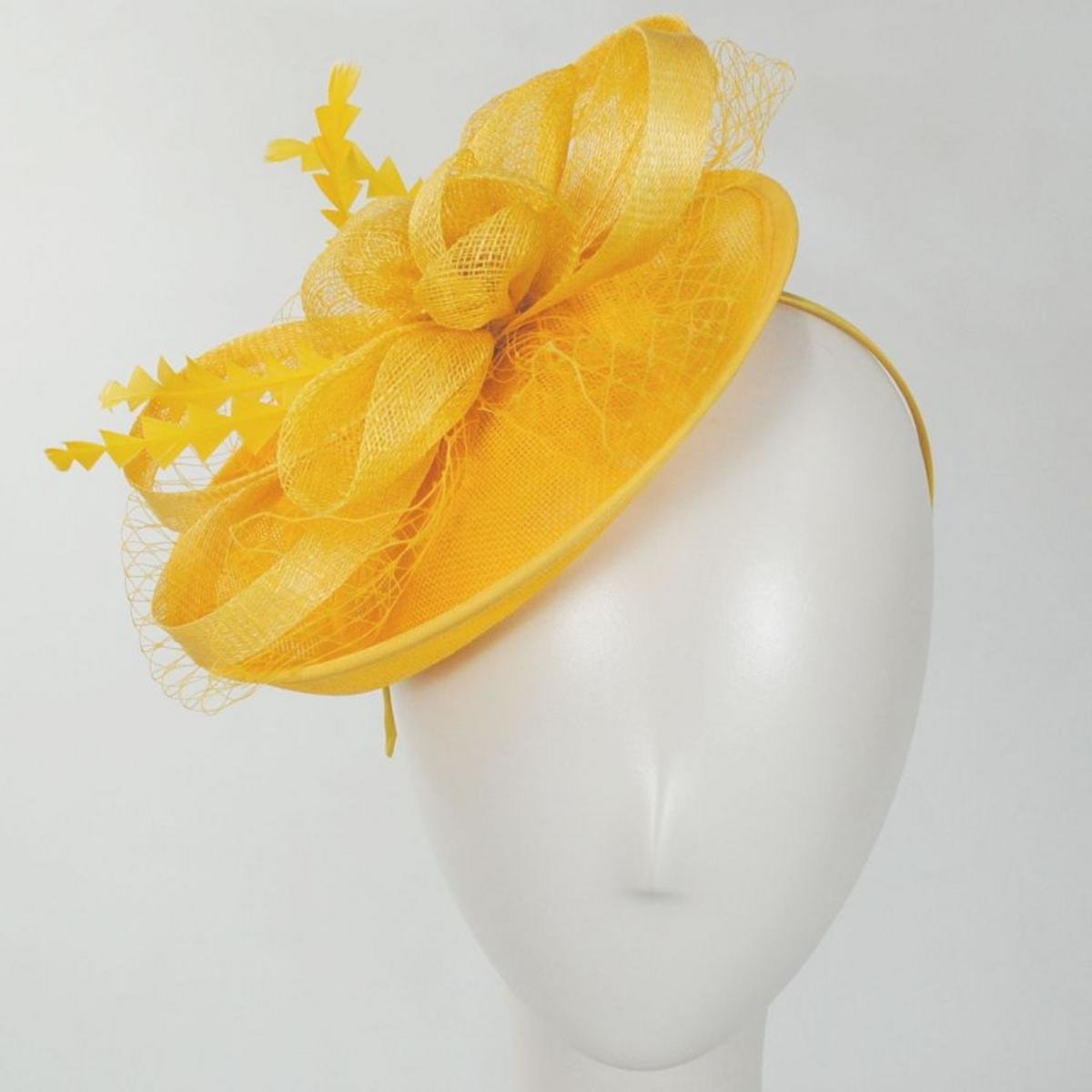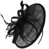 The Irene Sinamay Straw Fascinator Hat designed by Jeanne Simmons is small but mighty. This fascinator features feathers, sinamay straw ribbons and bows, and mesh details atop a stiff, curved sinamay straw dish. Also the tonal headband is chic but comfortable. Or choose to wear via the metal alligator hair clip instead.