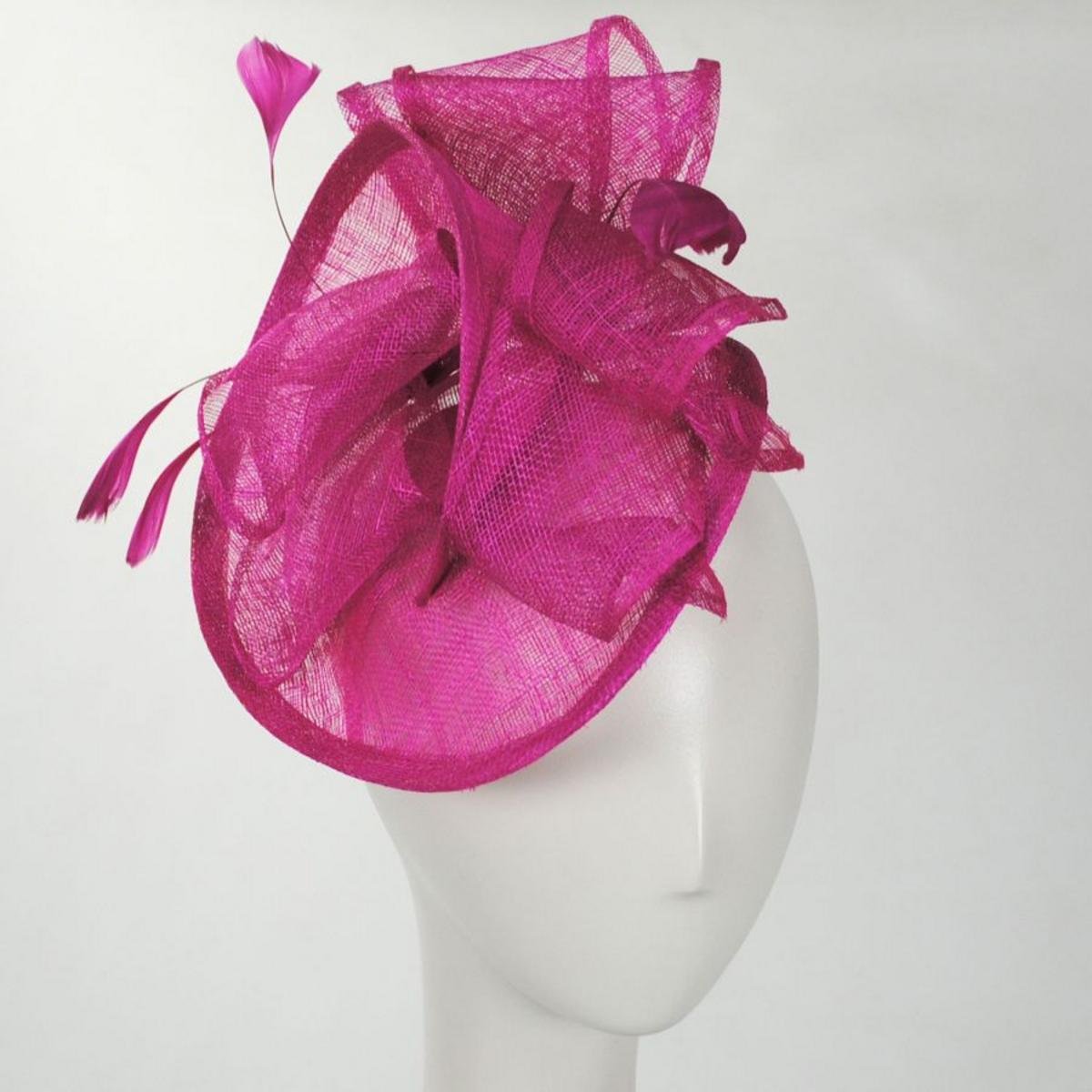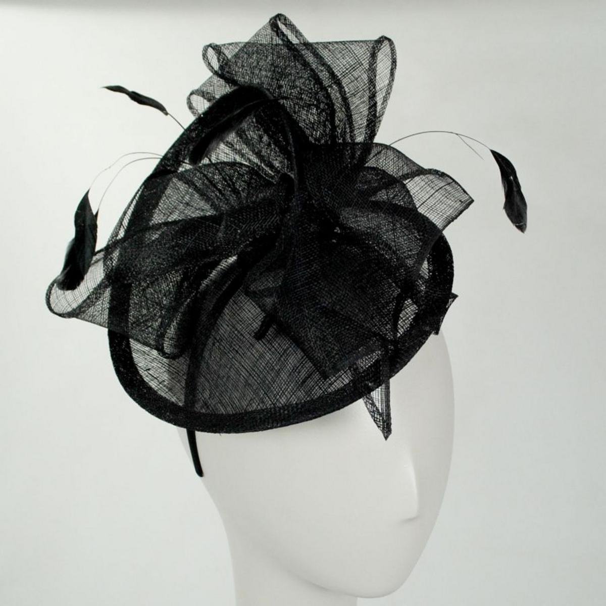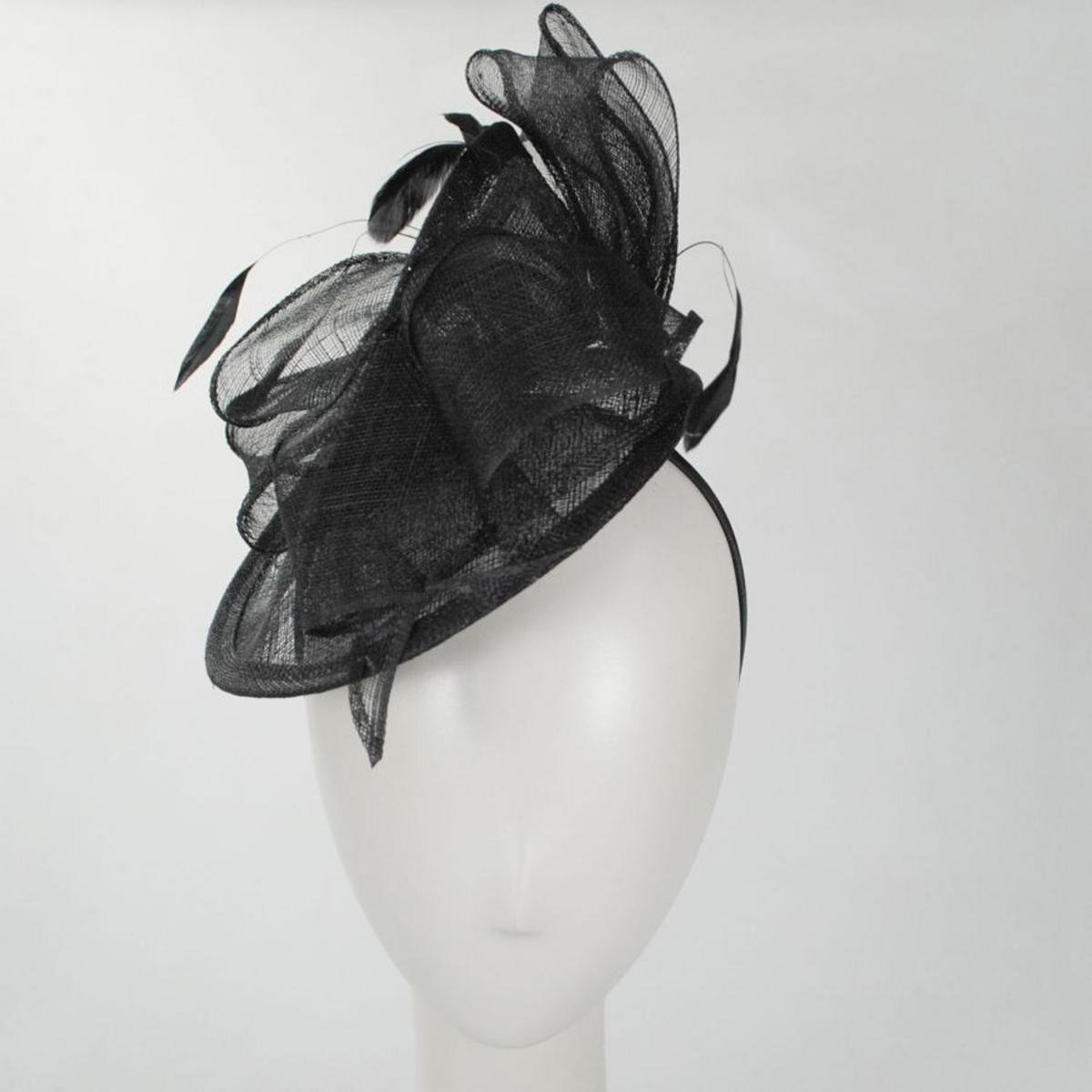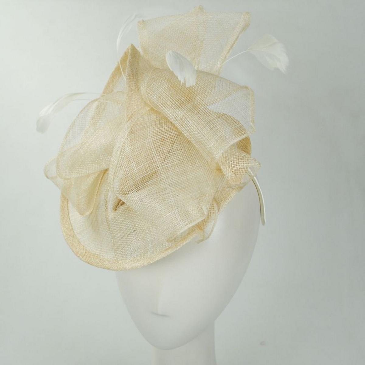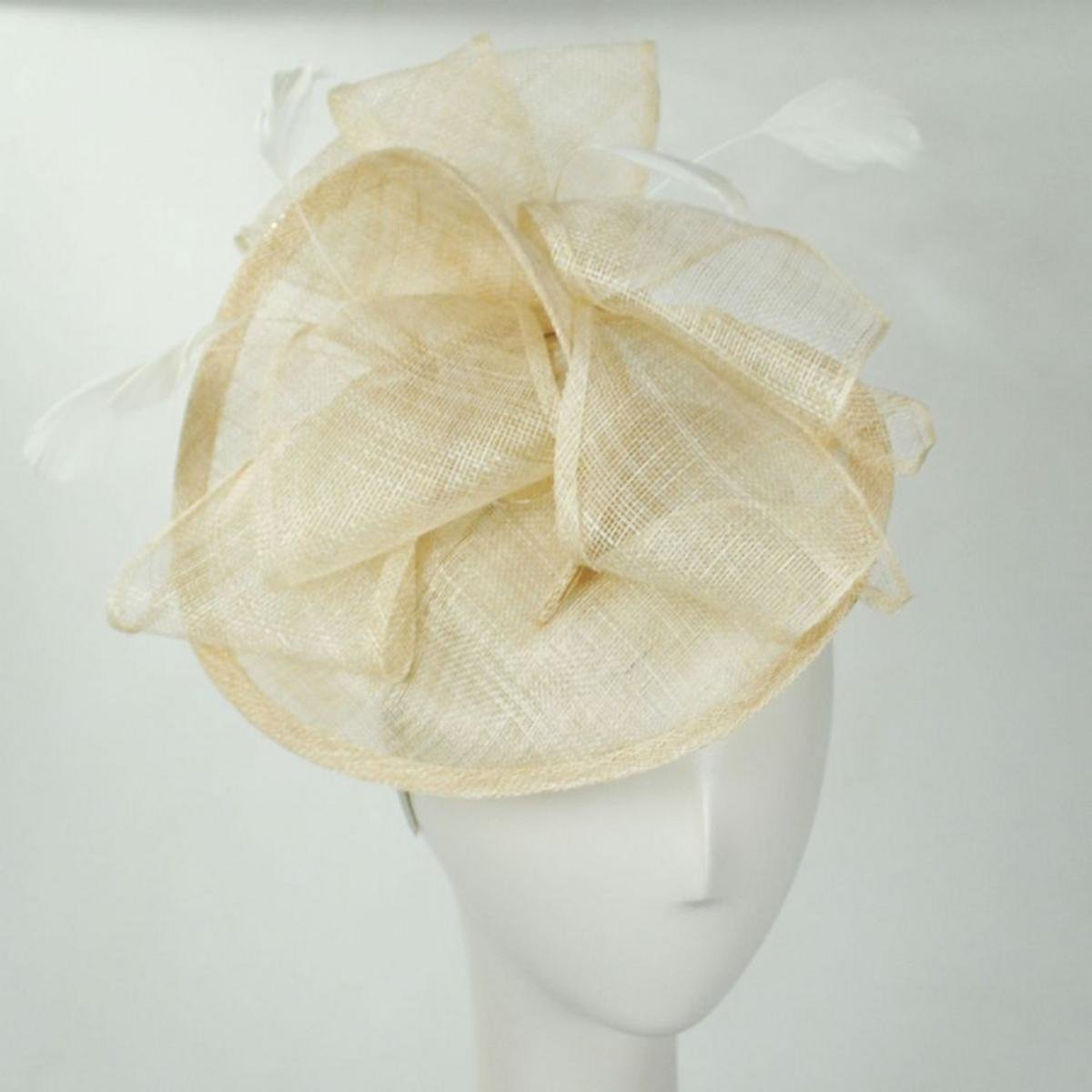 A headwear piece that brings to mind abstract sculptures, there is no doubt that the Isabelle Sinamay Straw Fascinator Hat by Jeanne Simmons is a work of art. Constructed and shaped of sinamay straw, the disk base is asymmetrical and swirled which adds height and dimension. The sinamay straw bows and feather accents add more interest, giving an overall intricate yet delicate look.